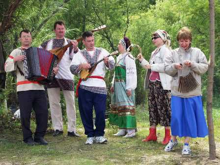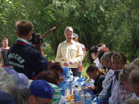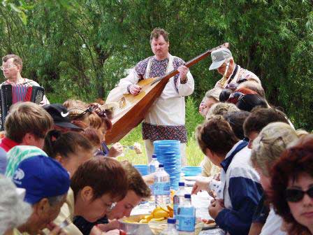 船によっては自然がそのまま残されている岸辺を選んで船を停め、あとは何もせずに乗客の自由にさせる場合もあるが、外国人を乗せる船では船側が何らかの企画をすることが多い。この船では、岸にテーブルをしつらえてウハー(川魚のスープ)などの食事をふるまってくれた。同行している歌舞団が音楽のプレゼントもしてくれ、さらに食後にはダンスやゲームも用意されていた。左上の写真は、食事の席で挨拶をする船長。 (2002年8月撮影)
