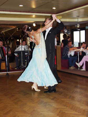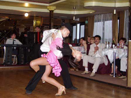 民族舞踊でないこういうダンスを船客に踊らせるのではなくて、踊って見せるというのは珍しい。踊っている2組は極東ロシアだったか全ロシアだったかはっきり聞き取れなかったが、とにかくそういう選手権大会に出場か入賞か優勝かをしたというレベルの人達らしかった。 (2002年8月撮影)