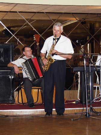 この時はサクソホンの名手という初老の紳士も同行していて、よくソロを聴かせてくれた。背後の楽員が持っているのはロシアの民族楽器バヤン。 (2002年8月撮影)