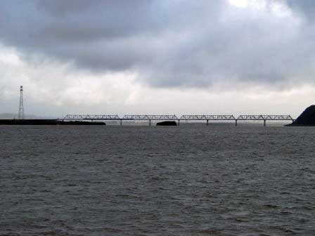 アムール川にかかる橋は全部で2つしかないという話を聞いた。一つがハバロフスクのそれで、もう一つがコムソモリスクの鉄橋なのだそうだ。ここも鉄道・道路兼用橋だが、2層にはなっていなくて、両者が隣り合って並行に走っている。 (2002年8月撮影)