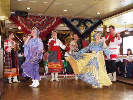 どの河川の船旅でも乗客が退屈しないように船側は様々なプログラムを用意する。圧倒的に多いのはロシアの民族舞踊や民謡を見せたり聞かせたりするというものだ。こういう催しが夜ごとに開かれる。 (2002年8月撮影)