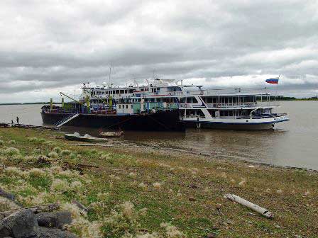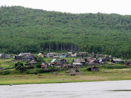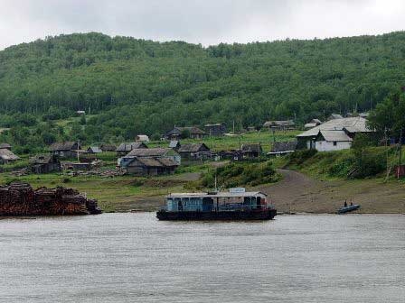 川を航行していると両岸は森や草原ばかりで人里を見かける事は多くないが、何時間おきかに時々こういう寒村が岸に現れる。写真はアムール川右岸にある小さな村タンボフカ。 (2002年8月撮影)