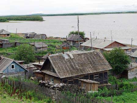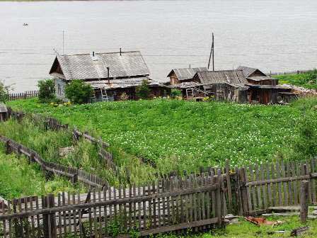 川岸に建つ住宅群。ロシアのどこの村でもそうであるように、各戸には狭からぬ庭があり、そこを畑にしている家が多かった。短い夏の間に収穫物を得て厳しい冬に備えるのであろう。 (2002年8月撮影)