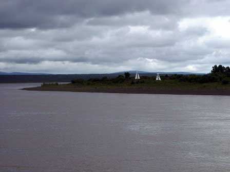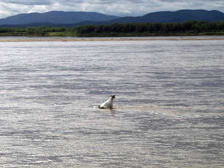アムールだけではなく、船舶が運航する大きな河川には随所に航路標識やブイが設置されている。写真の三角形の白い板は、この2枚が重なって見える向きに船を進めると良いという意味らしい。ただ、標識の置かれた岸や中州は川の流れによって絶えず浸食されているわけだから、土台をえぐられて流されてしまうことはないのかなどと余計なことが心配になった。 (2002年8月撮影)