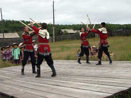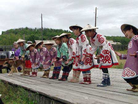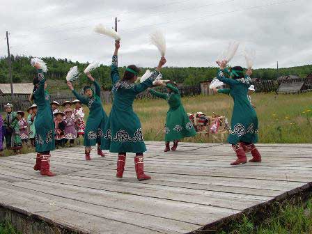 郷土史博物館の裏庭に設けられた木製の舞台で若い男女のグループが踊るウリチ族の民族舞踊。 (2002年8月撮影)