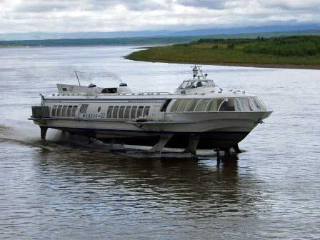 人を運ぶのにはこういう形の水中翼船が多く使われる。大型船に比べると定員では見劣りするが、何と言っても船足の速いのがウリで、ハバロフスクから河口に近いニコラエフスク・ナ・アムーレまで12時間で行くと言ったロシア人がいたけれど、ほんとうだろうか。 (2002年8月撮影)