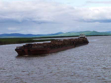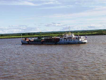 鉄道網が全く無く、道路建設も困難な北部シベリアやアムール下流域で、河川の交通路としての重要性は私達の想像を超えるものがあるはずである。しかも、冬季には河川は凍結して航行不能になるわけだから、短い夏の間に必要な物資の輸送は済ませておかなければならない。写真はコンテナを運ぶ貨物船。 (2002年8月撮影)