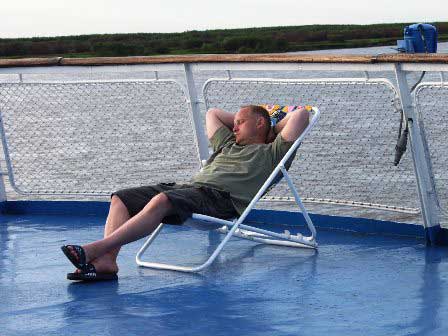 川を船で行く旅の魅力は何と言っても川の流れと同じように時間がゆったりと過ぎていくことである。岸辺の町や村に寄って観光したり現地の人々と交流するのももちろん楽しいが、こうして船のデッキで時の流れに身を任せていられるのも無上の喜びと言える。 (2002年8月撮影)