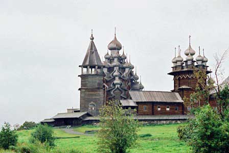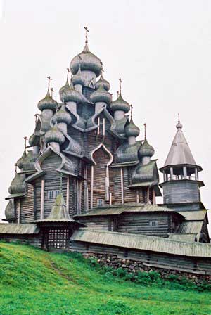 同じような展示場がオネガ湖に浮かぶキジ島にもある。と言うより、こちらはあまりにも有名。ユネスコの世界文化遺産にも指定されているプレオブラジェンスカヤ教会。 (1998年8月撮影)