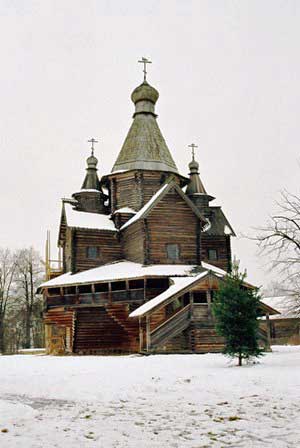 その修道院からいくらも離れていないところに古い木造建築物を集めた展示場がある。そこに、置かれていた木造の教会。映画「ドクトル・ジバゴ」にはこれのもっと小さなものが出てきたような気がするから、村の教会としてはかなり立派なほうに属する? (1997年12月撮影)
