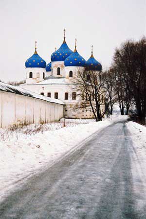 ノブゴロド市郊外ヴォルホフ河畔にある修道院。観光地としても有名なところだが、さすがに真冬のこの時期では閑散としていて、中の寺院の扉にも錠がかかっていた。 (1997年12月撮影)