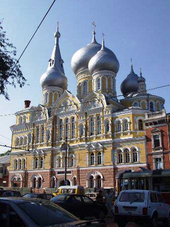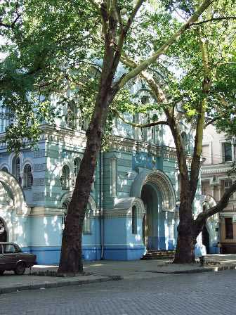 オデッサ市内を散歩していて見かけた教会。建物の外壁に色彩感があふれるように感じるのは、黒海に面した南の地方だからという思いこみからか。 (2003年8月撮影)