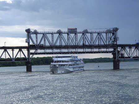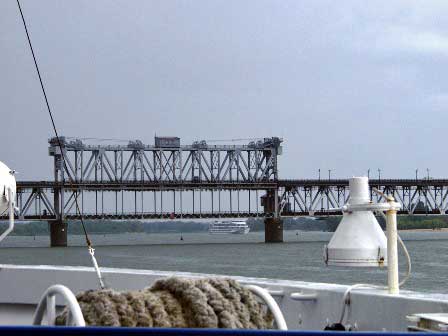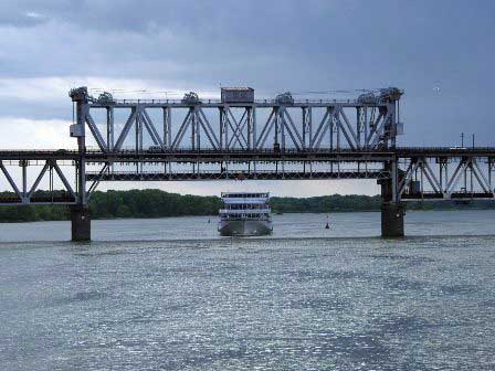 クレメンチュク河港のすぐ下流側にある橋。自動車・鉄道兼用橋で、船がくぐる時は下層の鉄道部分が上げられる仕組みになっている。 (2003年8月撮影)