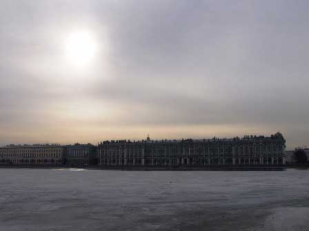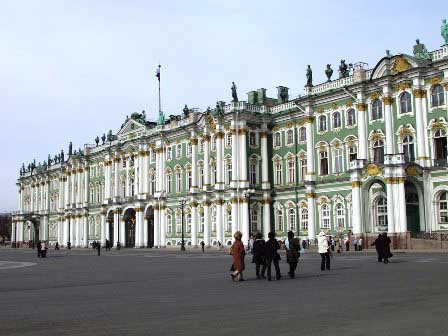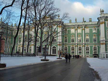 エルミタージュ美術館の外観。帝政時代の冬宮の建物がそのまま美術館として使われている。左の写真は宮殿広場側から、中央の写真はネヴァ川の対岸から、右の写真は中庭から撮ったもの。 (左:2005年3月,中:同4月,右:2020年2月撮影)