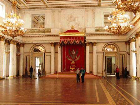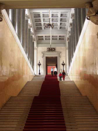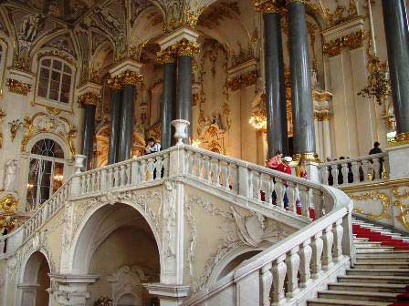 冬宮は3階建ての建物なので当然館内にはいくつもの階段がある。右の写真はそれらのうち最も代表的なもの。ロシアへ着任した各国の大使が信任状を提出するために冬宮を訪れた時に使ったという階段。左は、新館エルミタージュの表階段。 (2005年3月撮影)