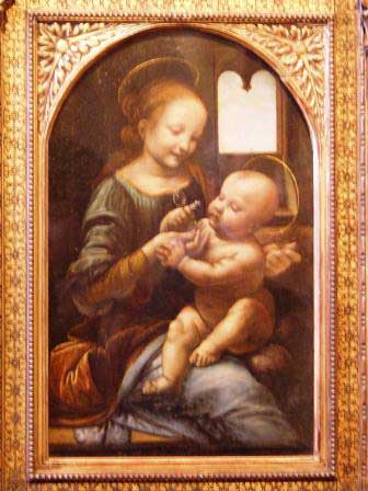 | エルミタージュの膨大な数の所蔵品の中で最もご自慢なのがレオナルド・ダ・ビンチの筆になる2枚の聖母像。左はその1枚「花を持つ聖母」。もう1枚の「リッタの聖母」に比べて聖母マリアが若く描かれている。 |