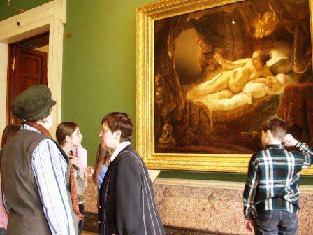 レンブラント「ダナエ」を見る参観者。ギリシャ神話によるこのテーマの作品としては、ティチアーノの同名のものもやはりエルミタージュにある。