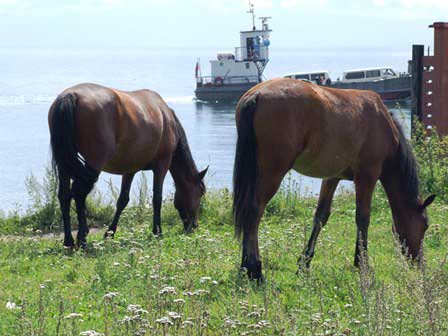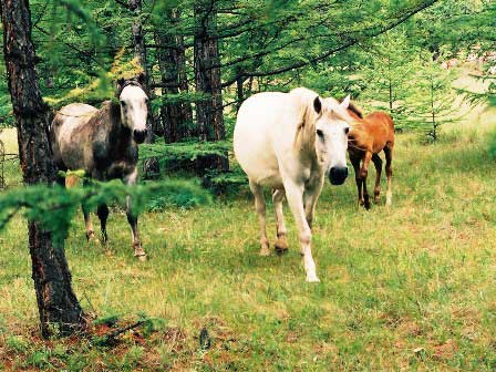 左は、バイカル湖畔シーダのキャンプ場近くの林の中で出会った馬たち。右は、同じくバイカル湖畔ポルト・バイカルの船着き場のあたりを歩き回っていた馬たち。 (左:1994年8月,右:2011年8月撮影)
