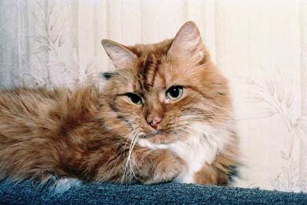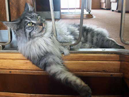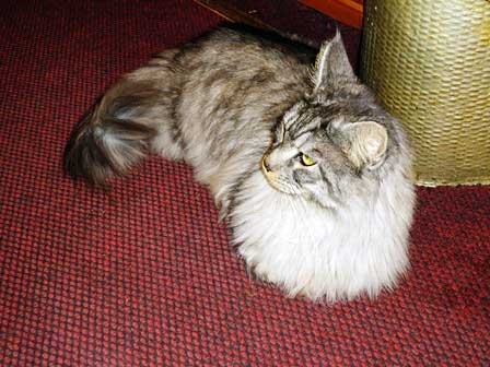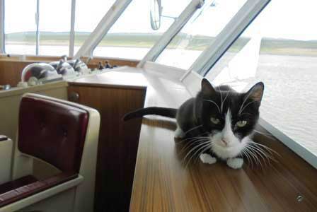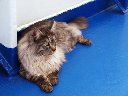 オカ川のクルーズ船内で飼われていた猫。毛がふさふさで尻尾の立派なのが特徴だったが、とにかく愛想が無く、船客達が撫でたりしようとするんだけど、いつも迷惑そうにしていた。 (2018年9月撮影)