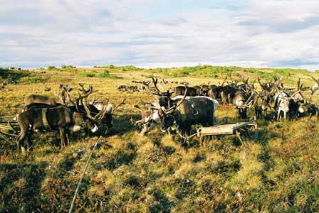 エニセイ最下流域で先住民が飼育しているトナカイの群れ。これももちろん放し飼いで、繋ぐのは橇を引かせるときだけ。 (1999年8月撮影)
