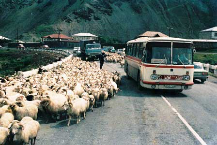 放し飼いの最たるものがこれ。道路を横切る羊の群れによって自動車が立ち往生させられるのは珍しいことではない。グルジア軍用道路で撮影。 (1984年8月撮影)