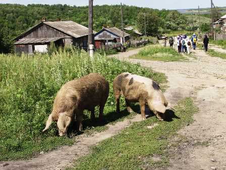 アムール河畔シカチアリャン村の中心部の道路。放し飼いの豚が熱心に草を食べていた。愚かにも、豚と言えば人間の残飯を与えられて食べるものとばかり思いこんでいたので、豚が路傍の草を、しかもそれをひきちぎる音を発しながら食べるのは「新発見」であった。 (2002年8月撮影)