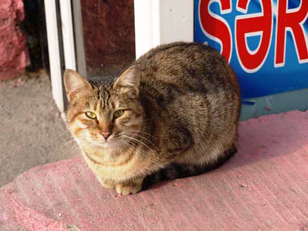 バクー市内を歩いていた時、何かのお店の前にいた猫。ちょっとこちらを警戒している感じもある。 (2019年12月撮影)