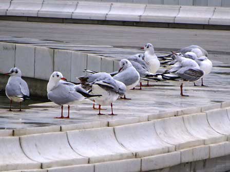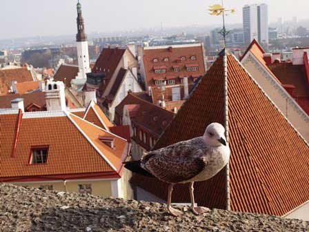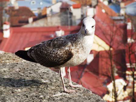 タリン旧市街を一望に見渡せる展望台の手すりにとまっている鴎。大勢の観光客がいて、決して静寂な環境ではないのに、飛び去ろうとはしない。誰かが餌をくれるのをひそかに待っているのか。 (2014年3月撮影)