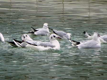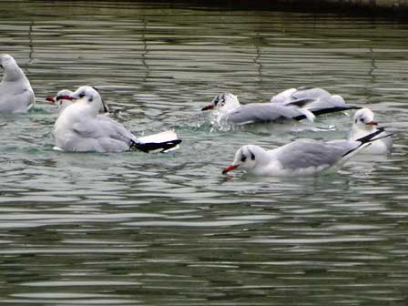 バクー市内の公園の池に群がっていたカモメたち。池の縁で翼をやすめているのもいれば、池の中を泳いでいるのもいた。 (2019年12月撮影)