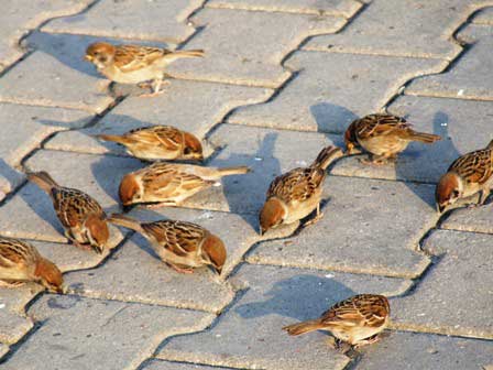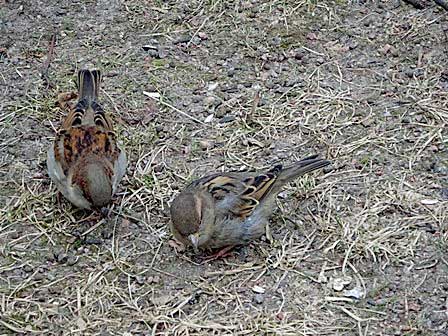 ペテルブルクのアレクサンドロフスキー庭園にいた二羽の雀。こちらも、人間のすぐ足下だというのに平然と餌を探していた。 (2020年2月撮影)