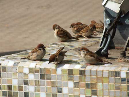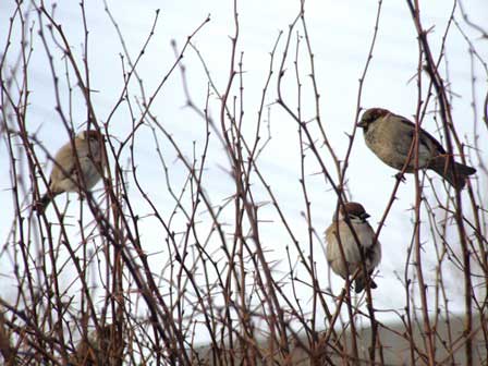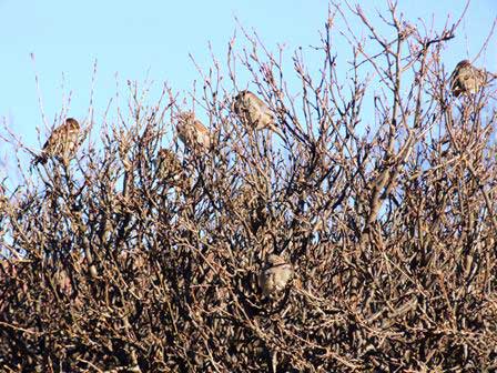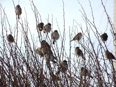 タリンの旧市街を歩いていたら、ずいぶんと賑やかな小鳥の声がする。どこにいるのかと見たら、すぐそばの枯れ木の茂みに群がっていた。枯れ枝がカムフラージュになっていて、安心しているのか。 (2014年3月撮影)