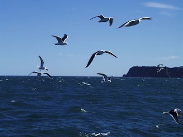 カムチャッカのアヴァチャ湾上を舞う鴎たち。船のスクリューで水がかきまわされると魚たちが水面近くに上がってくることがあるからか、とにかく船にまつわりつく。 (2000年8月撮影)