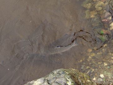 色覚検査みたいな写真で申し訳ないが、水面下に鱒が泳いでいるのがおわかりだろうか。オホーツク海に注ぐ小さな川を産卵のために遡上する鱒たち。 (2006年8月サハリン島南部オチェプハ川にて撮影)