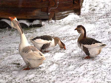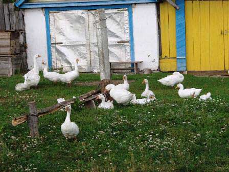 左は、ボルガ河畔ボルガリの村で撮った写真。家禽として飼われている鵞鳥。右は、スズダリの木造建築物博物館の敷地内で放し飼いになっていた鵞鳥。 (左:2007年8月,右:2014年12月撮影)