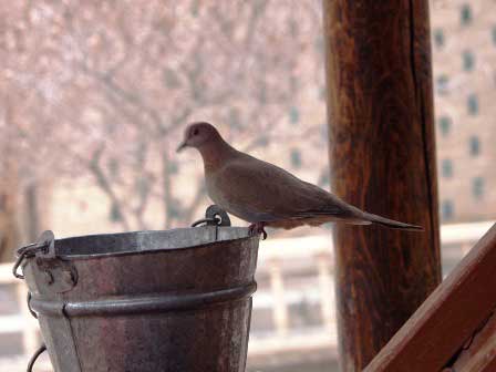 ヒワ城内、パフラン・ムハマド廟境内にあった手水鉢らしいバケツにとまった小鳥。 (2006年12月撮影)