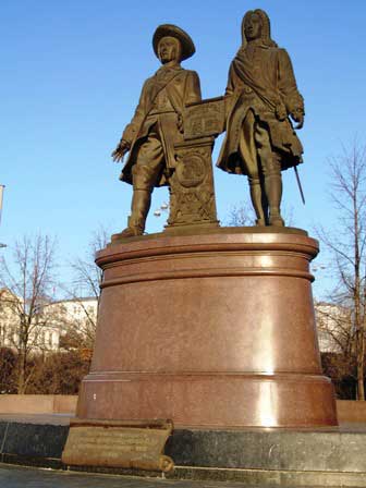 ピョートル大帝の命でエカテリンブルグを創設したとされる、デ・ゲニンとタチーシチェフの像。 (2018年2月撮影)