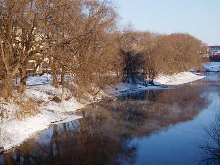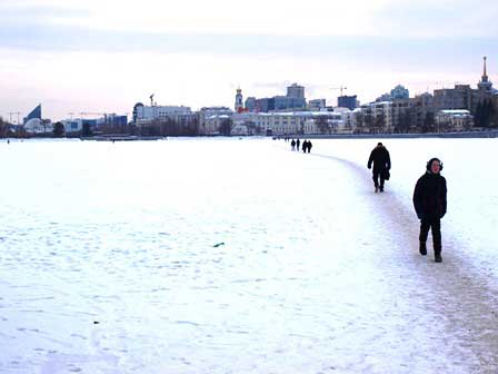 市の中心部をイセチ川という小さな川が流れていて、川岸が市民の散歩道になっているだけでなく、途中でせき止められて町の中に小さからぬ池が作られている。夏にはボートなどを浮かべるのかもしれないが、冬季にはこうして近道として利用されている。 (2018年2月撮影)