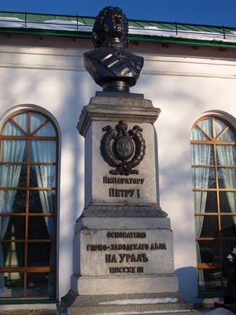 ピョートルI世によって、鉱物資源の豊富なウラルのこの地に金属工場が建てられたのが、この街の工業の礎になったとか。左は、ピョートルI世像。ちなみに、「エカテリンブルク」の町の名前は、ピョートルI世の妻エカテリーナI世に由来すると言われる。 (2018年2月撮影)