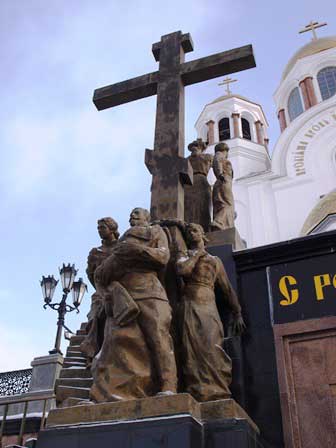 「血の上の教会」のすぐ背後に、教会のほうを向いて立つウラルのコムソモールを讃える像。もちろん、こちらのほうが教会よりもかなり早い時期に建てられた筈。左の写真の背後に見える教会は、「血の上の教会」とは別の教会なので念のため。 (2018年2月撮影)