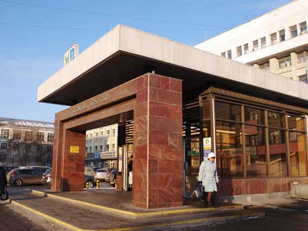 エカテリンブルは、人口100万人を越える大都会で、公共交通機関としてどこの都市にもあるもののほかに地下鉄が走っている。写真は、中心部のある駅の出入口。屋根に付いている「M」のロゴマークが、モスクワやペテルブルクのとは少し違うかもしれない。 (2018年2月撮影)