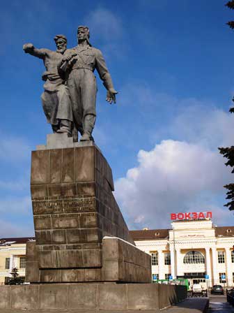 シベリア鉄道の旅客駅。駅前広場には巨大な兵士の像が立っていた。 (2018年2月撮影)