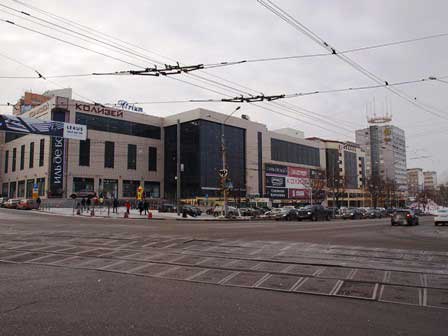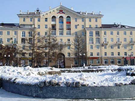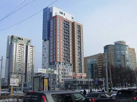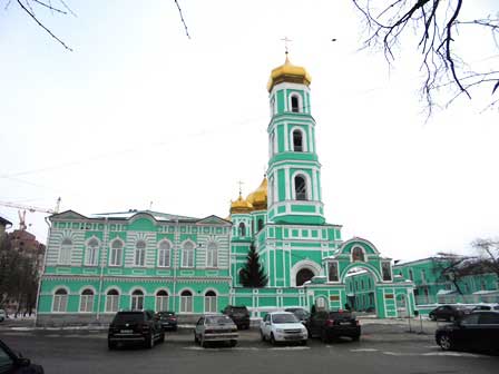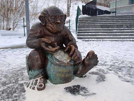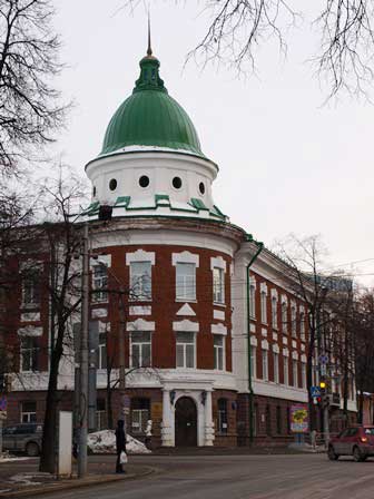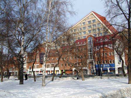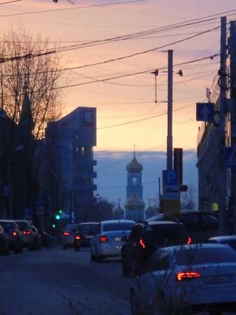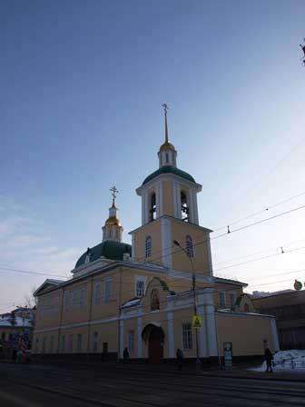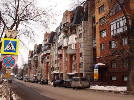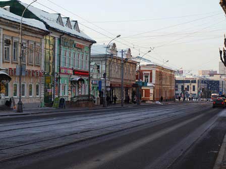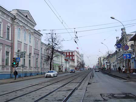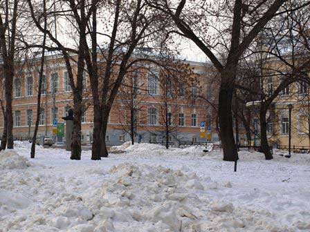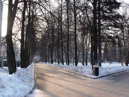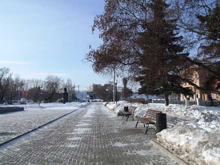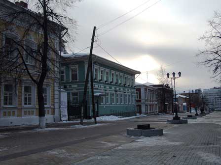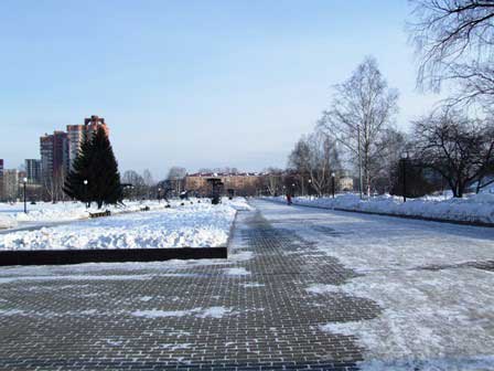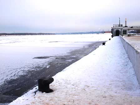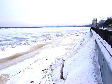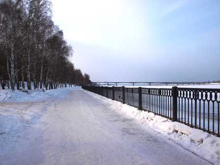 河港から下流方向に左の写真のような遊歩道が整備されているだけでなく、各種屋台のための施設や、ロシアにしては珍しくしっかりした公衆トイレも比較的短い間隔で置かれている。訪ねたのが川が凍りついている季節だったので、トイレ以外は閉鎖されていたが、季節が季節なら大勢の市民で賑わうのが想像できる。 (2018年2月撮影)