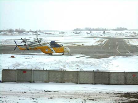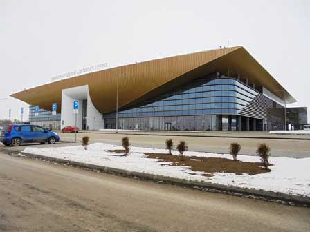 ペルミ国際空港。左の写真がターミナルビル。たまたま私が利用した時がそうだったのかもしれないが、エプロンではヘリコプターが目立った。 (2018年2月撮影)