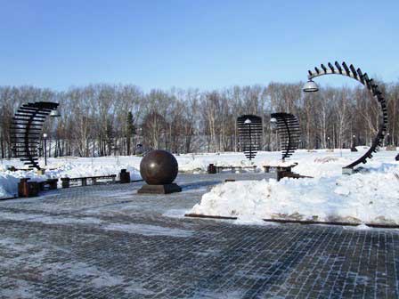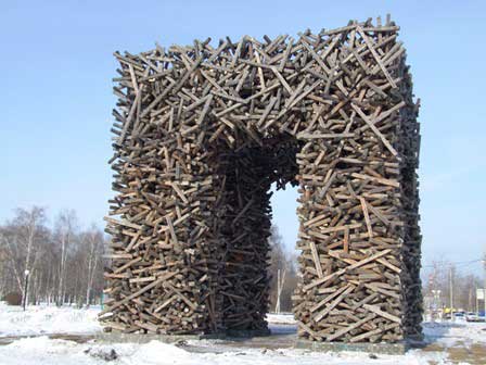 直訳すると「石の公園」だが、ペルミII駅の前にある広場。木片を集めて作ったように見えるオブジェは「ペルミの門」と呼ばれる。 (2018年2月撮影)