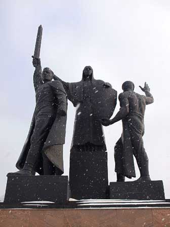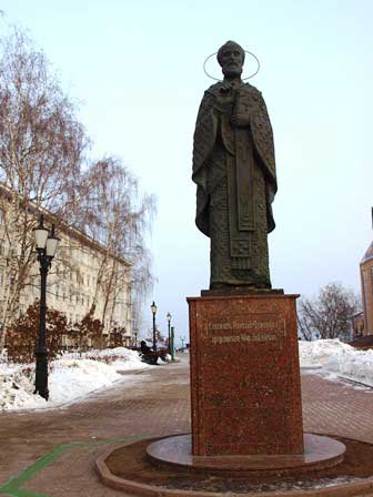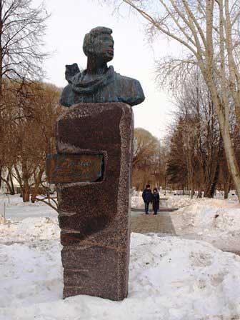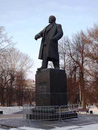 左は、聖ニコラス像。カマ川を背にして立つ。中は、パステルナーク像、右は、レーニン像。この二つは、オペラ・バレエ劇場の前にある。 (2018年2月撮影)