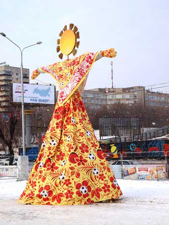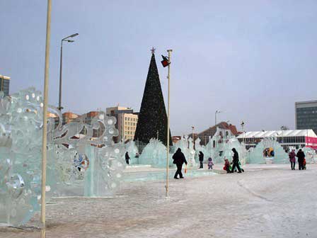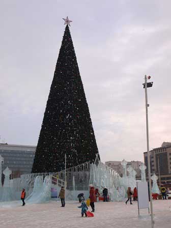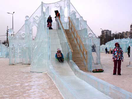 市のメインストリートに面した広場に、氷の滑り台や氷の迷路、それに氷の彫刻が置かれて、家族連れが楽しんでいた。太陽を表す大きな人形が立っていることから、マースレニッツァだとわかるが、なぜヨールカも立っているのかは不明。 (2018年2月撮影)