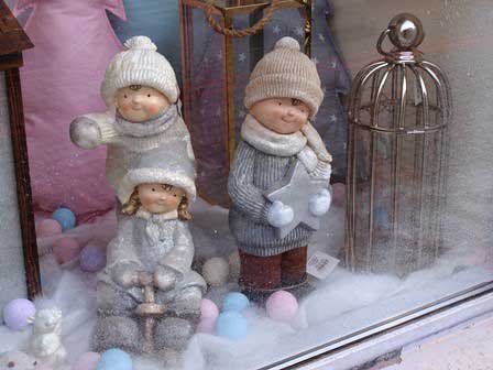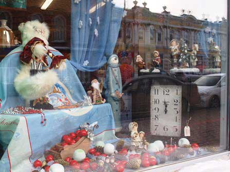 ソ連時代は、商店に大きなショーウィンドウを備えて外を歩く人々に誘いかけるというのはそう多くはなかった気がする。寒い国だから、窓などの開口部を大きくすると、暖房効果に影響するということもあったのかもしれない。しかし、市場経済になって、それぞれのお店としてはそんなことは言っていられないので、今ではどの町でも工夫されたディスプレイが見られるようになった。 (2018年2月撮影)